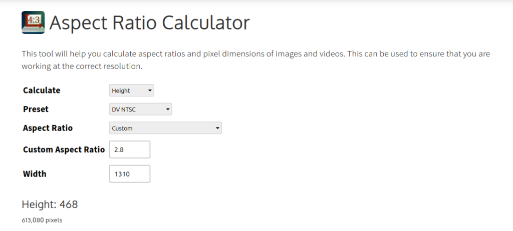 On the Aspect Ratio Calculator, switch the Calculate field to “Height”. This is what you want to find. Make sure Aspect Ratio is set to “Custom”. Enter “2.8” — the decimal equivalent for 14:5 — in Custom Aspect Ratio. Enter “1310” in Width. The calculator will return that the “Height: 468”.
